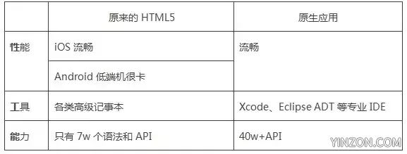 我们先谈谈HTML5原来不如原生应用的地方,业内俗称HTML5有“性工能”障碍。即HTML5性能不如原生、开发工具不如原生、能力调用不如原生。