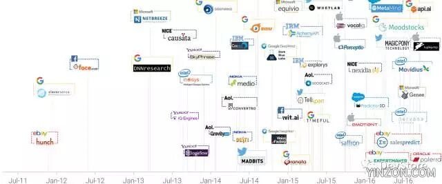 鉴于 AI 的这些优点,一些大公司如谷歌、IBM、eBay,以及 Facebook 都已经开始着手布局,陆续收购了一些擅长人工智能技术的初创公司。下面这张图就能清晰得看出: